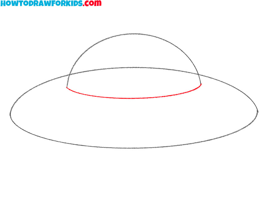 To give the UFO drawing more dimension, sketch an additional long arc on the side edge of the base. This second curve should closely follow the shape of the first one. This simple line is the side edge of the aircraft, the most protruding part of the body.